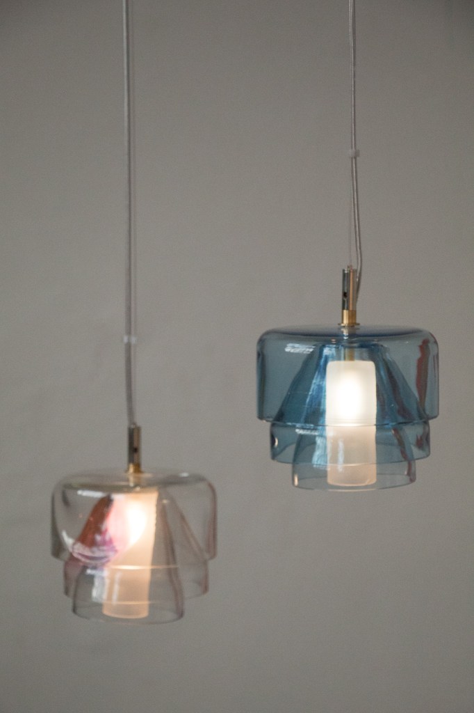 The pendant light „STACK“ is a fascinating work of art made of glass, crafted in the renowned „Glasmanufaktur Harzkristall“. It consists of a total of five interlocking rotating bodies, made of lightly blue glass or in a second version of clear glass with different colored spots. Through skillful layering, a harmonious play of colors is created, either transitioning from a gentle blue hue to a deeper and more intense blue or with overlaying the different colored spots creating a mixture of the overlayed. The pendant light „STACK“ combines craftsmanship precision and aesthetic design, lending timeless elegance and enchanting atmosphere to any space.